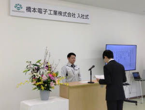 社長挨拶と幹部紹介の後、新入社員から自己紹介と決意表明があり、先輩社員からの祝辞という流れでした。